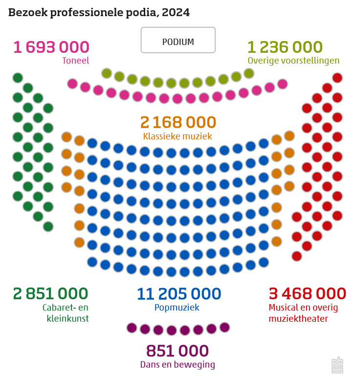 Het CBS publiceerde in januari 2026 de meest recente cijfers (2024) van podiumorganisaties in Nederland waar professionele podiumkunsten worden vertoond. Het betreft een samenvoeging van de cijfers van podia die zijn aangesloten bij de VNPF (poppodia) en de VSCD (theaters en schouwburgen), aangevuld met door het CBS zelf verzamelde gegevens van onder andere grote concertlocaties zoals AFAS Live en Ziggo Dome. Cijfers over festivals zijn hier niet in meegenomen.