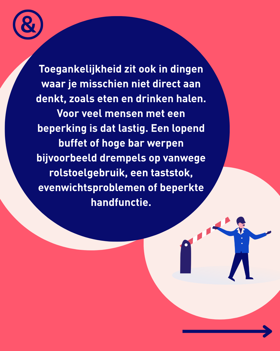 Een lopend buffet of een hoge bar kunnen voor mensen met een beperking een drempel vormen. Met een simpele, gastvrije benadering voorkom je ongemak en vergroot je zelfstandigheid.